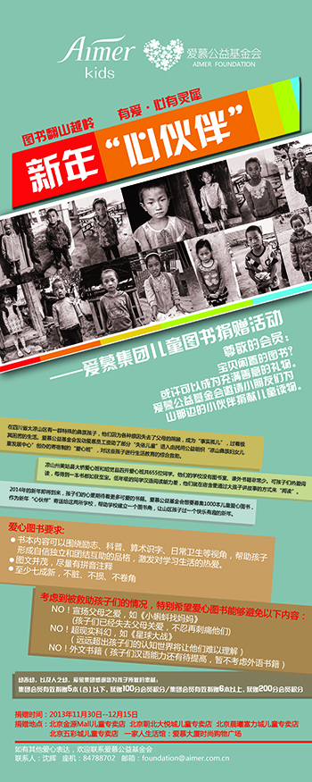 新年将至,爱慕员工决定为凉山孩子送上一份新年礼物。2013年11月23日-12月10日,基金会发起了“新年心伙伴——为凉山孩子募集图书”活动。活动得到了爱慕员工的热烈响应。短短10天内,公司488名员工,共捐赠购书款6760元(购买新书877册,羽毛球42桶504个)。爱慕员工、顾客、会员积极参与活动,捐赠图书394册。